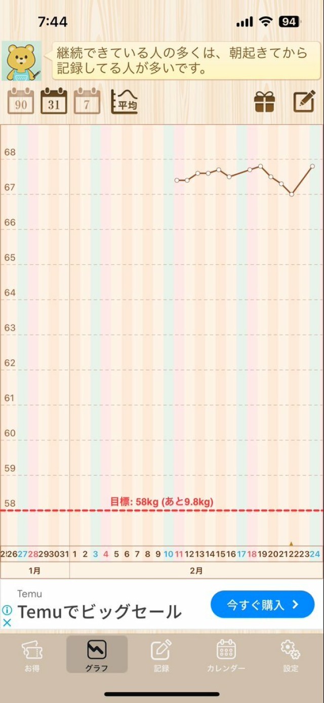 記録12日目 一瞬で戻った。。。 休日だからかな? すごいなぁ、食べないダイエットってあまり効果が続かないことがよくわかるぞ 0代 ダイエット X Facebook はてブ Pocket LINE コピー 2024.02.27 [Agent_T_CONTENTS]