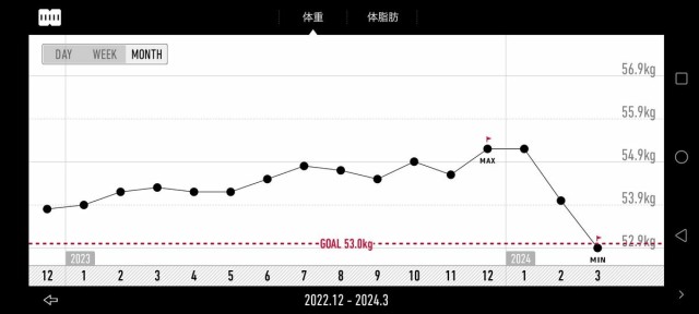 DAYで見るとジグザグ減ったり増えたりしてるんで分かりにくいけど、WEEKやMONTHで見ると減ってるのがわかる。 食べるダイエット最高楽しいな。今まで「減量?無理ー」って言ってたの何よ。 運動はお腹空くからしてない。週4クラスのヨガ仕事、たまに筋トレ稀にフィットボクシングだけ。 ダイエット X Facebook はてブ Pocket LINE コピー 2024.03.09 [Agent_T_CONTENTS]